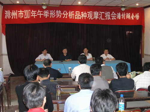 滁州市2007年午季形势分析、品种观摩及水稻产业提升行动实施情况汇报会于5月17日上午在潘村湖农场召开。滁州市农委负责同志和全市各市县区农委分管主任、种子管理站站长及大圹圩农场、潘村湖农场负责同志共50多人参加了会议。与会人员先后现场观摩了农场种子加工基地、小麦种子试验田、播量为5斤的稀繁田和种子生产大田,对田间小麦长势赞不绝口。