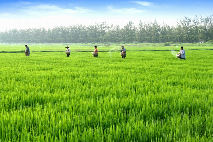 图为:龙亢农场一户家庭农场正在进行水稻施肥。