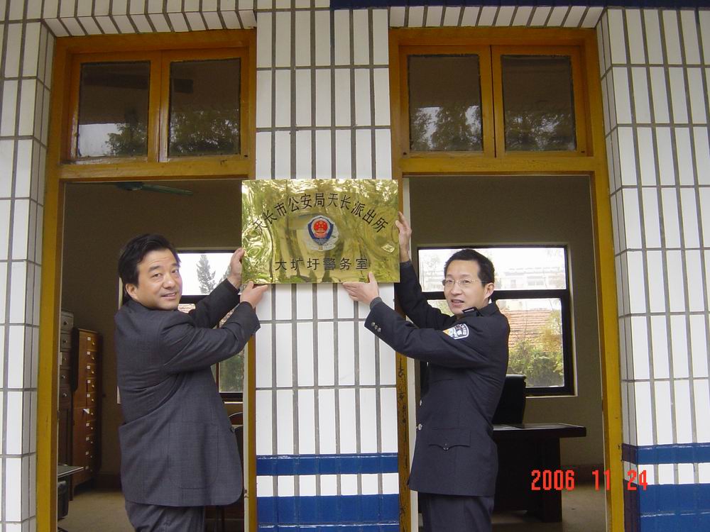 最近,天长市公安局在机构整合过程中,撤消了设在大圹圩农场场部的原天长市公安局大圹圩派出所。为了维护社会治安和农场稳定,保障一方平安,天长市公安局决定在大圹圩农场设立“天长派出所大圹圩警务室”。11月24日,天长市公安局天长派出所领导来农场为“大圹圩警务室”挂牌,场党委副书记杨朝幸代表农场参加了挂牌仪式。图为:杨朝幸副书记和天长市公安局天长派出所所长桑科共同为“大圹圩警务室”挂牌。