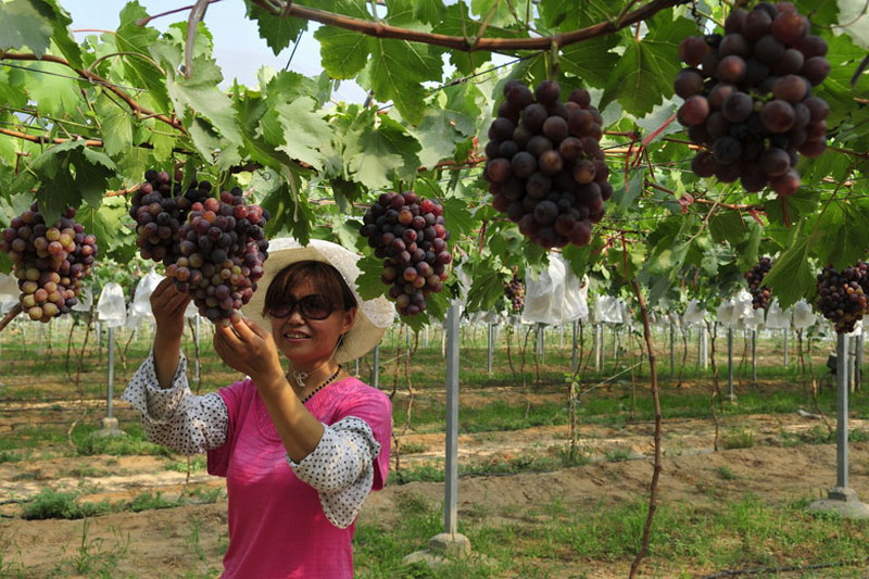 8月上旬,安徽农垦砀山果园场高效设施大棚园内一派繁忙,职工正在将一串串鲜艳成熟的葡萄采摘装箱,由皖垦果业有限公司销往全国各地市场。该场自2010年以来分三期建成葡萄高效设施大棚110亩,通过统一化生产、标准化管理和规模化经营,实现了一年建棚、两年见效、三年丰产的目标。今年一期、二期大棚葡萄亩产分别达1300公斤和800公斤,出园售价达16元/公斤以上,初步显现出高效农业的示范带动效应。